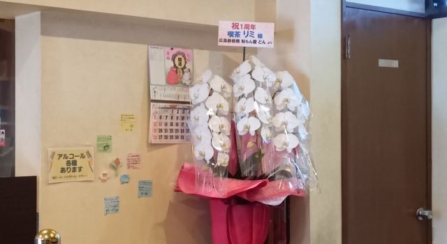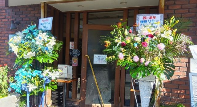 喫茶リミが2025年10月11日に開店一周年を迎え、多くのお客さんや関係者さんからお祝いのお花を贈られました。
