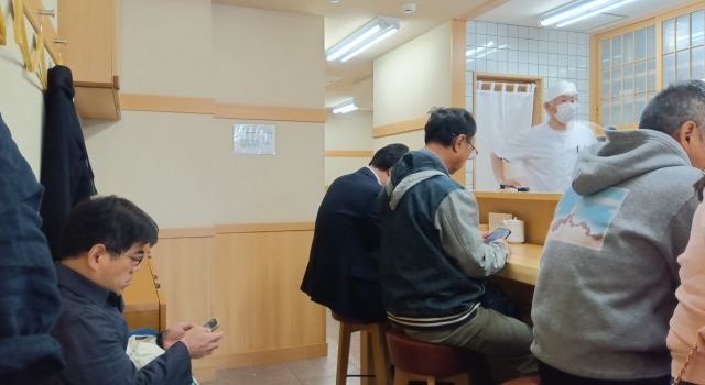 カウンターはすべて埋まり、カウンターの後ろにある順番待ちのイスに数名が座っていました。